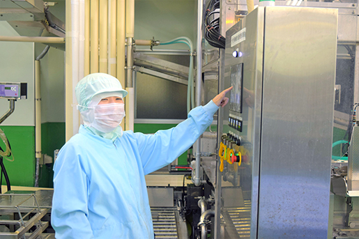 製造がスタートすると、袋詰めされた製品を手に取り、賞味期限の印字、包装資材の密閉状態を確認します。製造終了後は機械の清掃、翌日の製造準備、製造の記録票の確認を行っています。また、月に1度、包装資材の在庫確認や、温度計の点検などの業務を行っています。